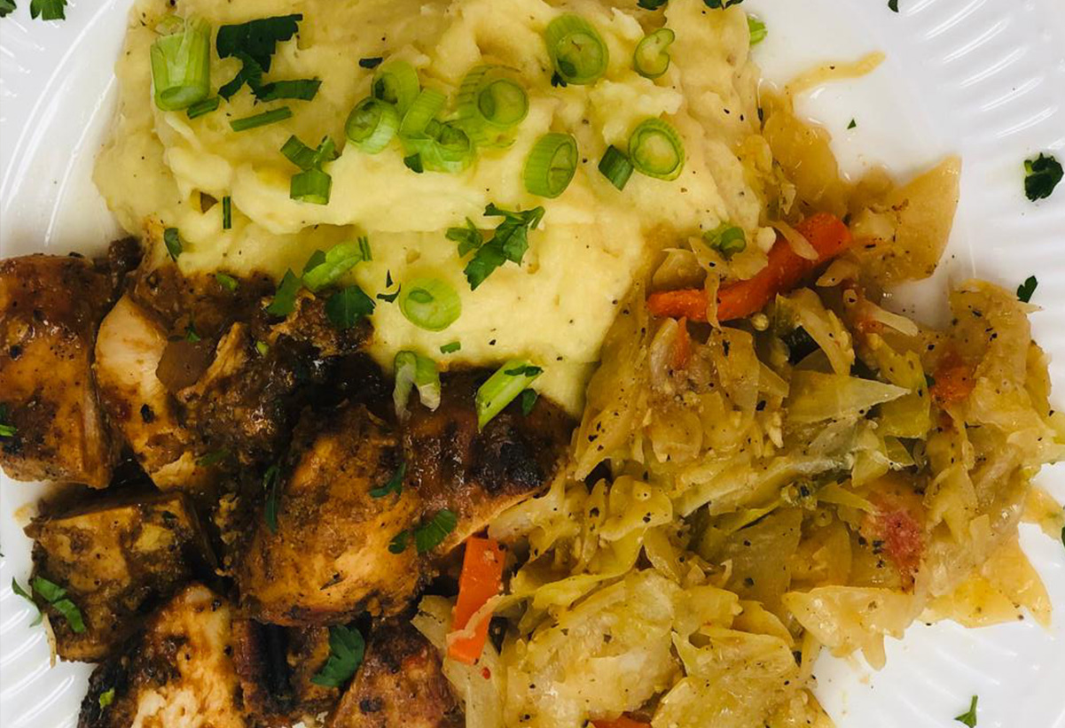 Grilled chicken marinated with tamarind sauce with steamed cabagge and our house made mash potatoes.