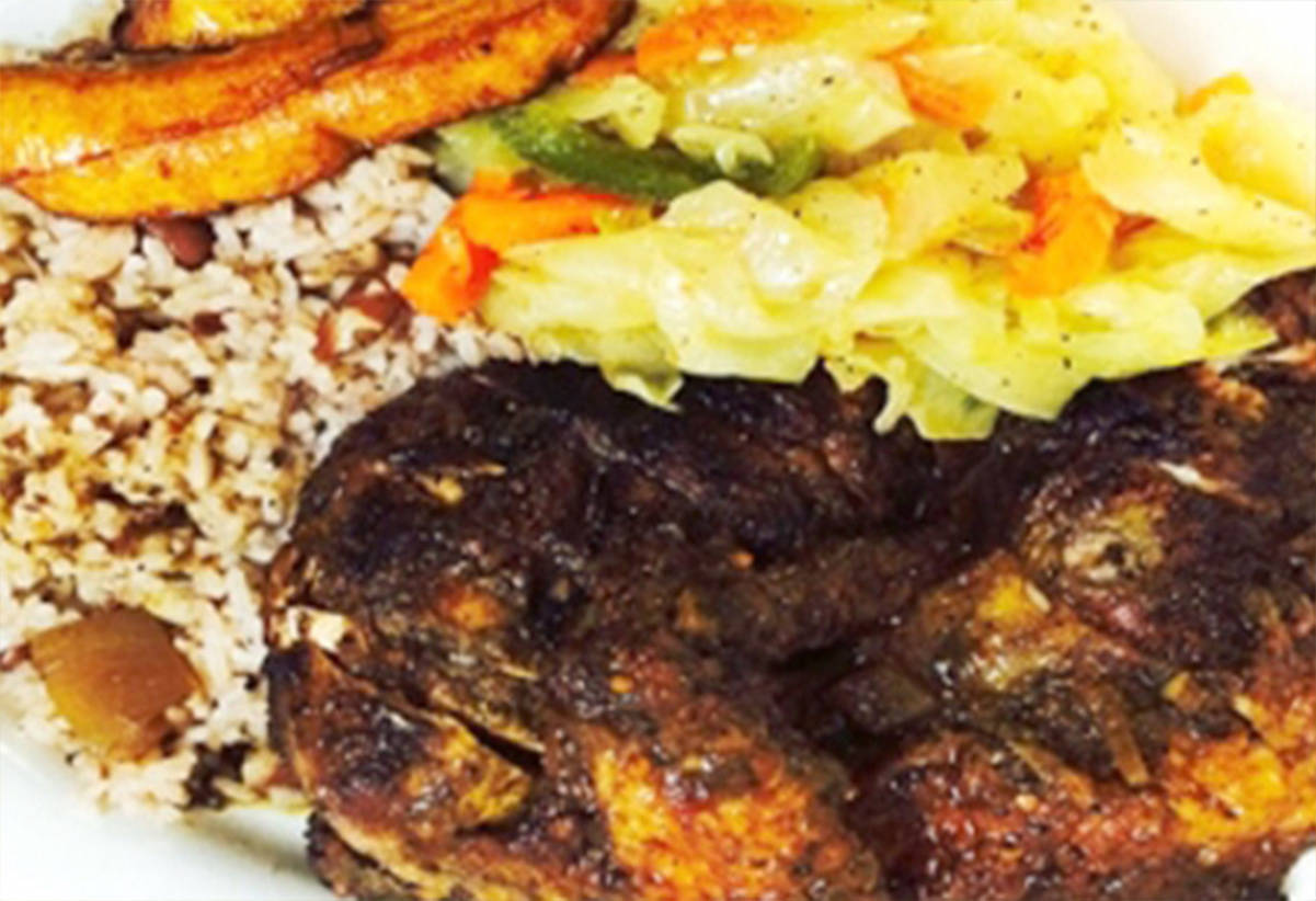 Grilled chicken with rice and beans, steamed cabbage, slice of plantain and our marinated traditional jerk sauce.