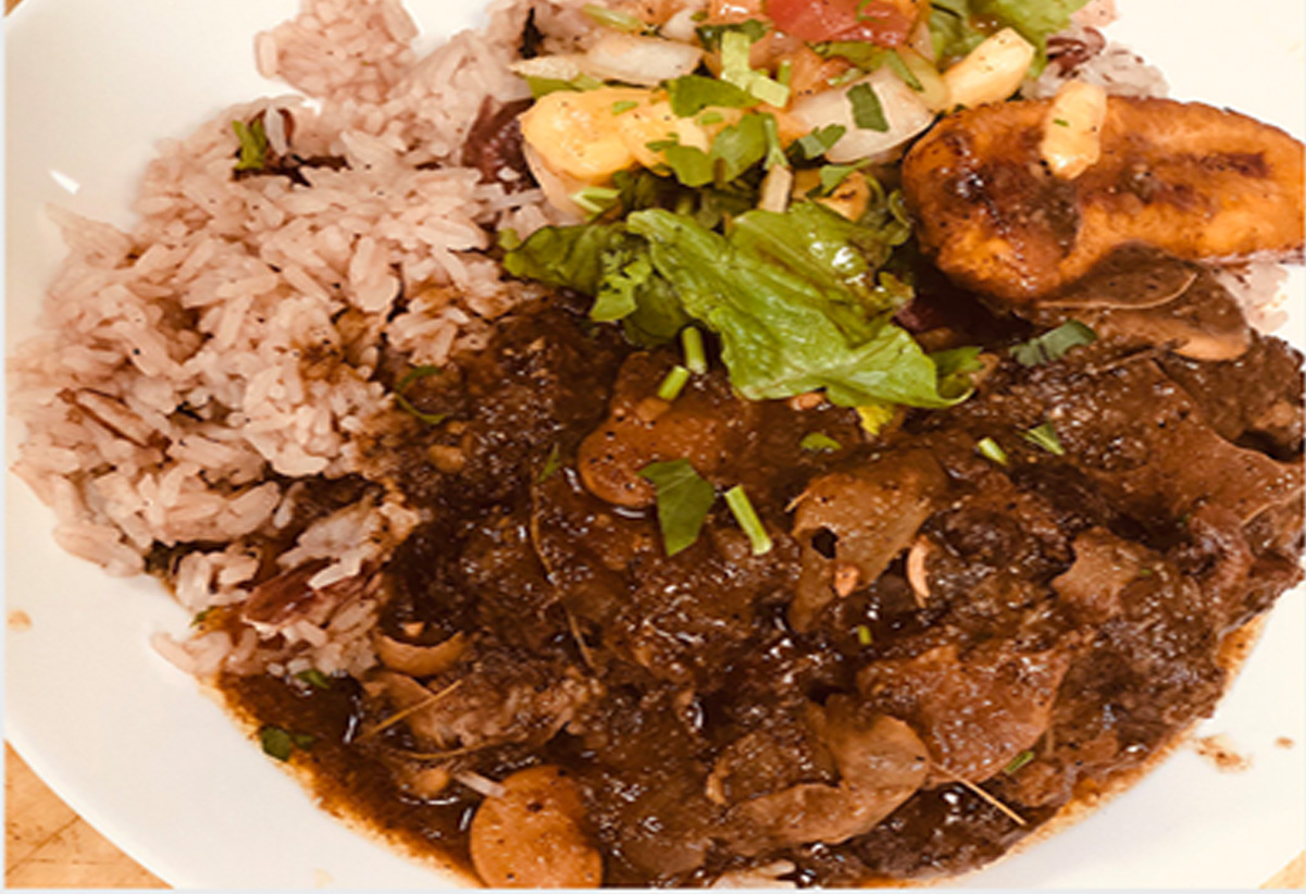Oxtail stew with butter beans flavored with thyme, scotch bonnet and onion medley served with brown rice and beans, plantain.