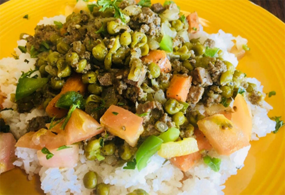 A delicious combination of sweet peas, green pepper, carrots, potato wedge, tomato and our specially marinated ground beef served on your choice of white or brown rice.
