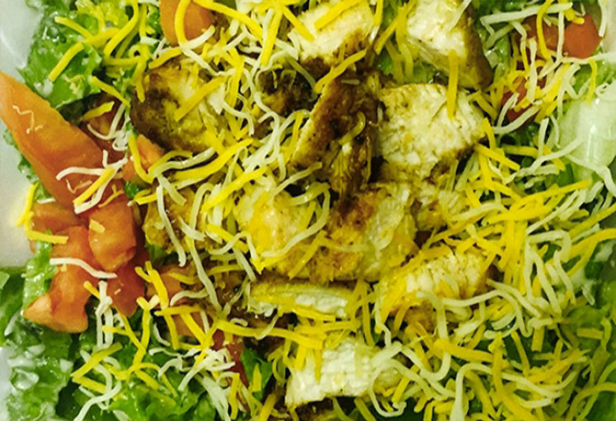 Freshly cut salad with grilled chicken, cheese, tomatoes, green peppers and banana peppers, simply fresh.